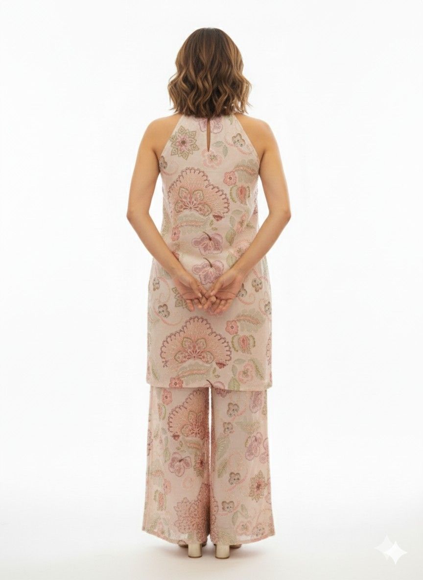Elevate your festive and occasion wear wardrobe with this stunning blush-pink halter kurti set, crafted for women who love subtle elegance with modern charm. The kurti features a contemporary halter neckline that beautifully frames the shoulders, while the all-over pastel thread embroidery adds richness and sophistication. The straight silhouette keeps the look sleek and refined, making it perfect for both day and evening celebrations. Paired with matching wide-leg embroidered palazzo, this co-ord set creates a graceful, elongated look—effortlessly stylish and incredibly comfortable.