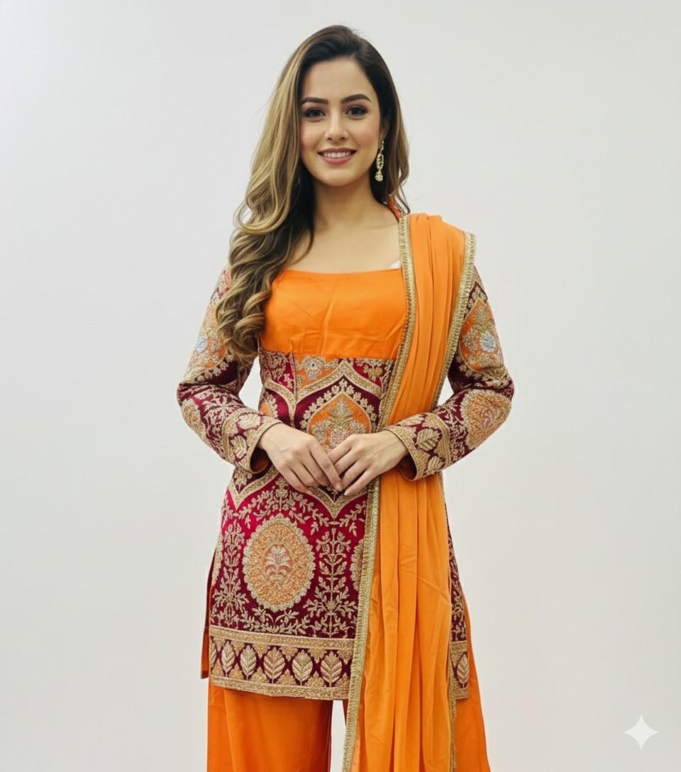 The vibrant orange palazzo pants bring a bright, youthful contrast, creating a striking color combination perfect for festive celebrations. Completing the look is a soft, lightweight orange dupatta bordered with delicate golden edging, adding charm and fluidity to the ensemble.