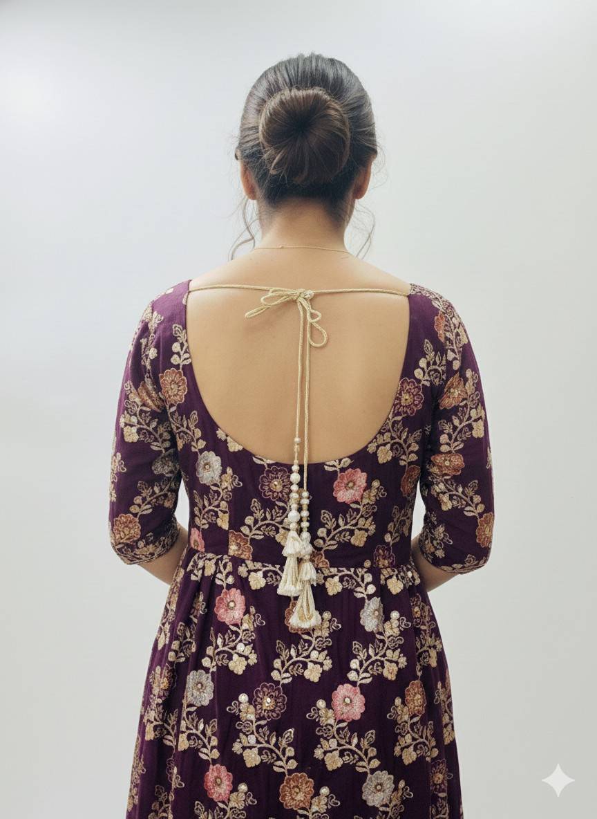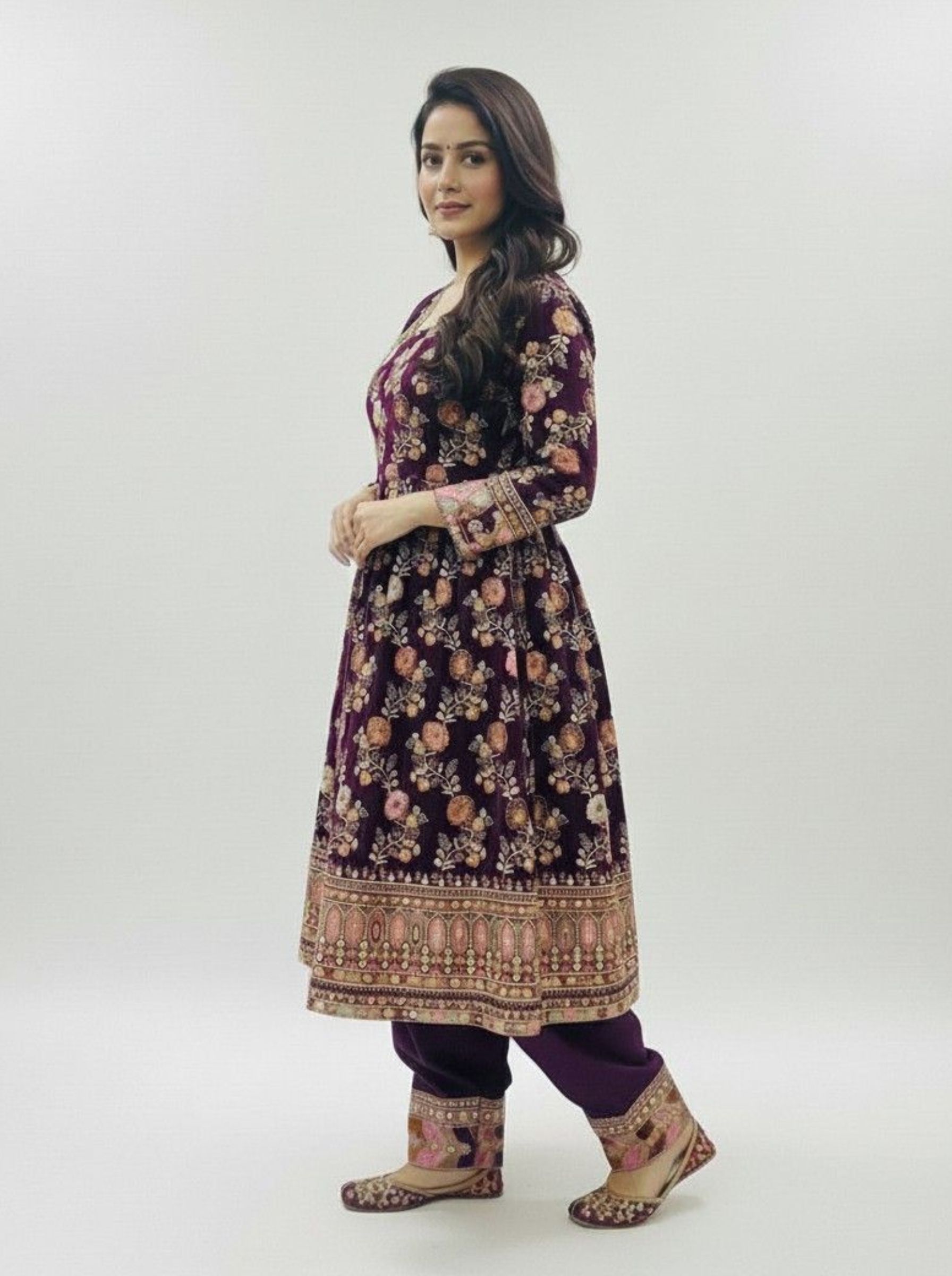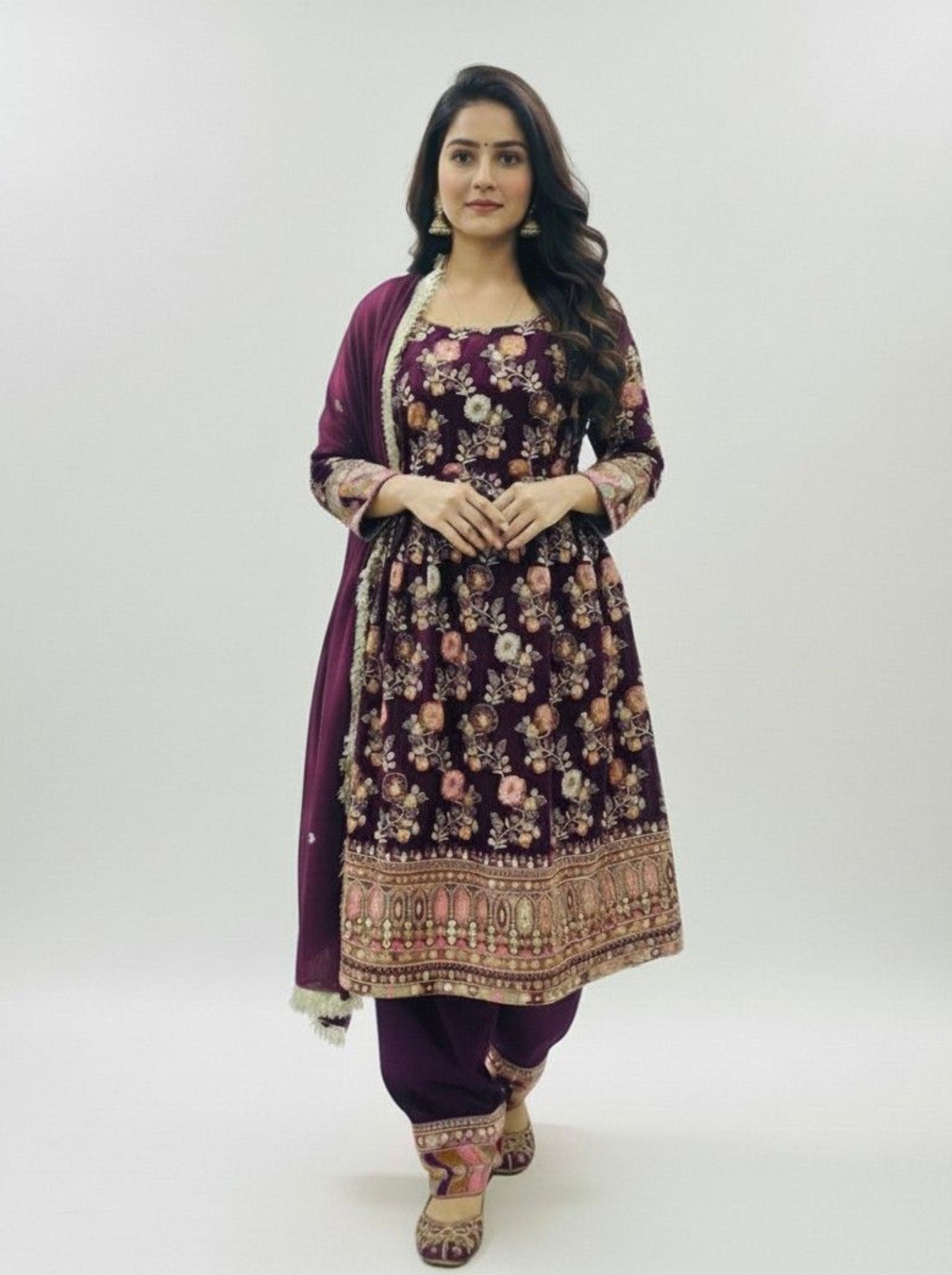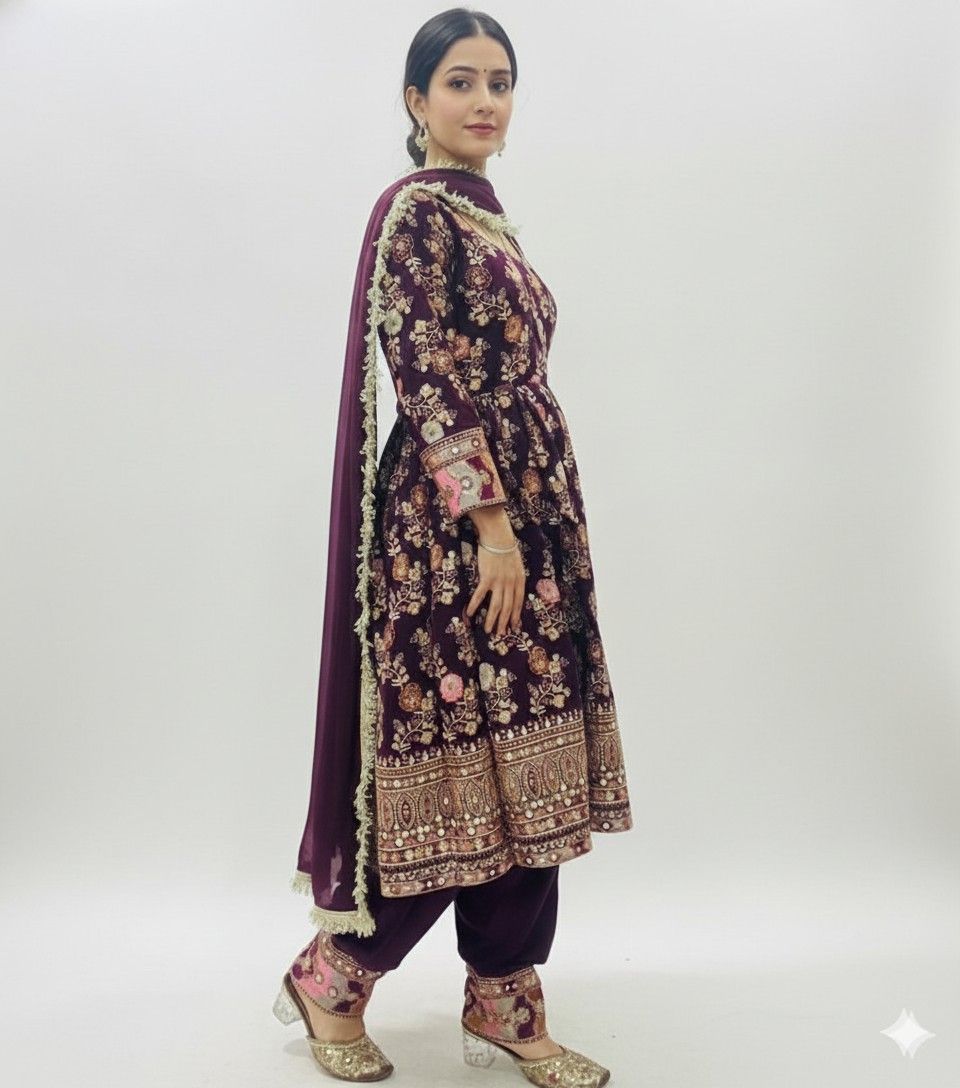 Enhance your festive wardrobe with this stunning frock-style kurti set, designed in a rich wine/maroon tone. The kurti showcases exquisite all-over floral embroidery with a beautifully detailed border that brings a regal charm to the outfit. Paired with a narrow poncha salwar and a matching dupatta, this set blends traditional elegance with modern comfort.